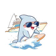 Catch the coolest vibes with this funny t-shirt! It features a smiling dolphin in sunglasses effortlessly surfing near a yacht.